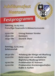 Am Samstag, den 24.05. um 15 Uhr startet das Jubiläumsfest mit einem Umzug aller ortsansässigen Vereine durch unsere schöne Ortschaft. Enden wird der Umzug in der Festscheune im Naenser Hohler Weg. Dort findet auch ab 18 Uhr der Festkommers statt. Ab 20:30 Uhr wird die Band „Sound and Show“ mit Livemusik für musikalische Unterhaltung mit Tanz sorgen.
