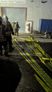 Die Feuerwehren aus Brunsen, Naensen und Stroit waren mit drei Atemschutztrupps im Einsatz. Für die Brandbekämpfung wurde eine Wasserversorgung aus einem offenen Gewässer aufgebaut. Zusätzlich kam technische Hilfeleistung zum Einsatz: Mit Hebekissen wurde der Container angehoben, um die eingeklemmte Person zu befreien.