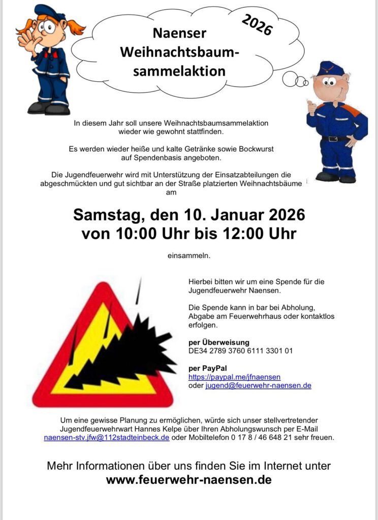 Um eine gewisse Planung zu ermöglichen, würde sich unser stellvertretender Jugendfeuerwehrwart Hannes Kelpe über Ihren Abholungswunsch per E-Mail naensen-stv.jfw@112stadteinbeck.de oder Mobiltelefon 0 17 8 / 46 648 21 sehr freuen.